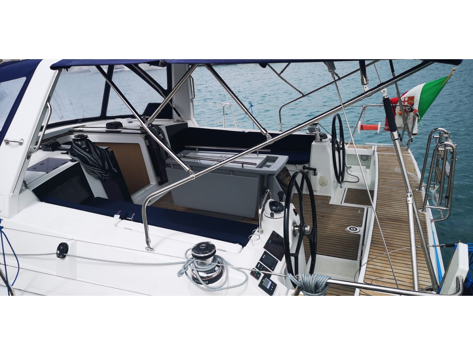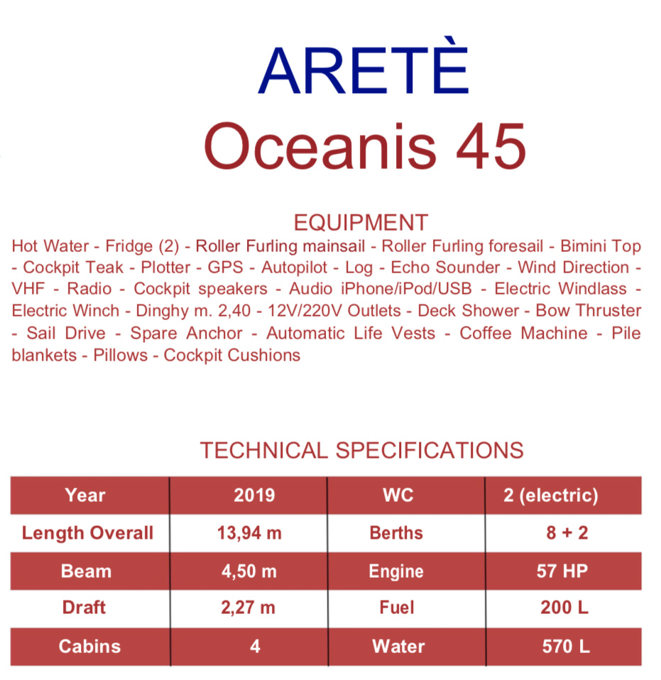 Sailing yacht, year of build: 2019, Marina d'Arechi, Salerno, model: Oceanis 45 Asteria - Standard line, cabins: 4, heads: 2, berths: 10. The yacht has standard charter equipment including autopilot, electric anchor winch, Bimini top, sprayhood, GPS plotter, depth sounder, wind sensor, log, dinghy, Wi-Fi.