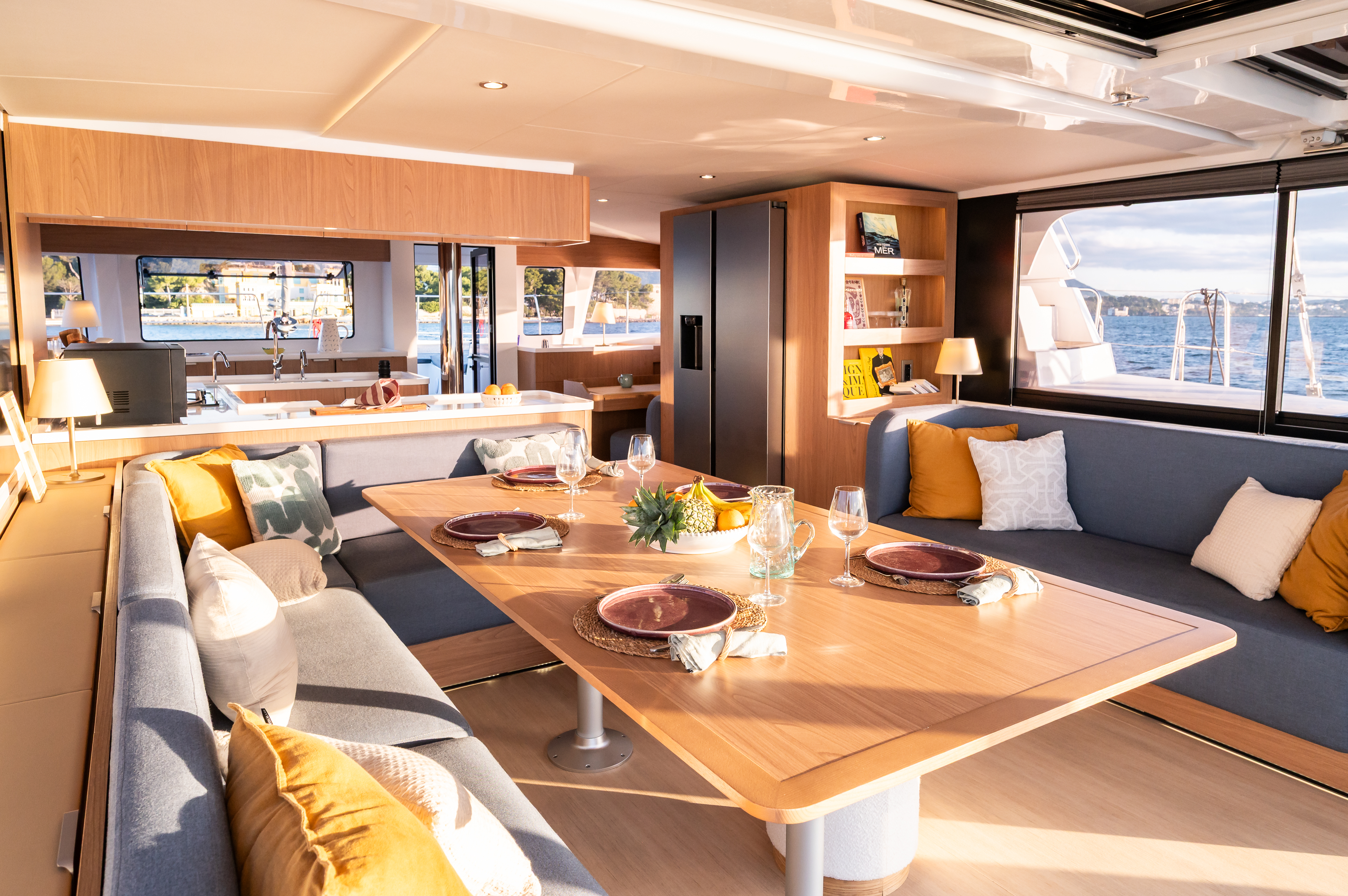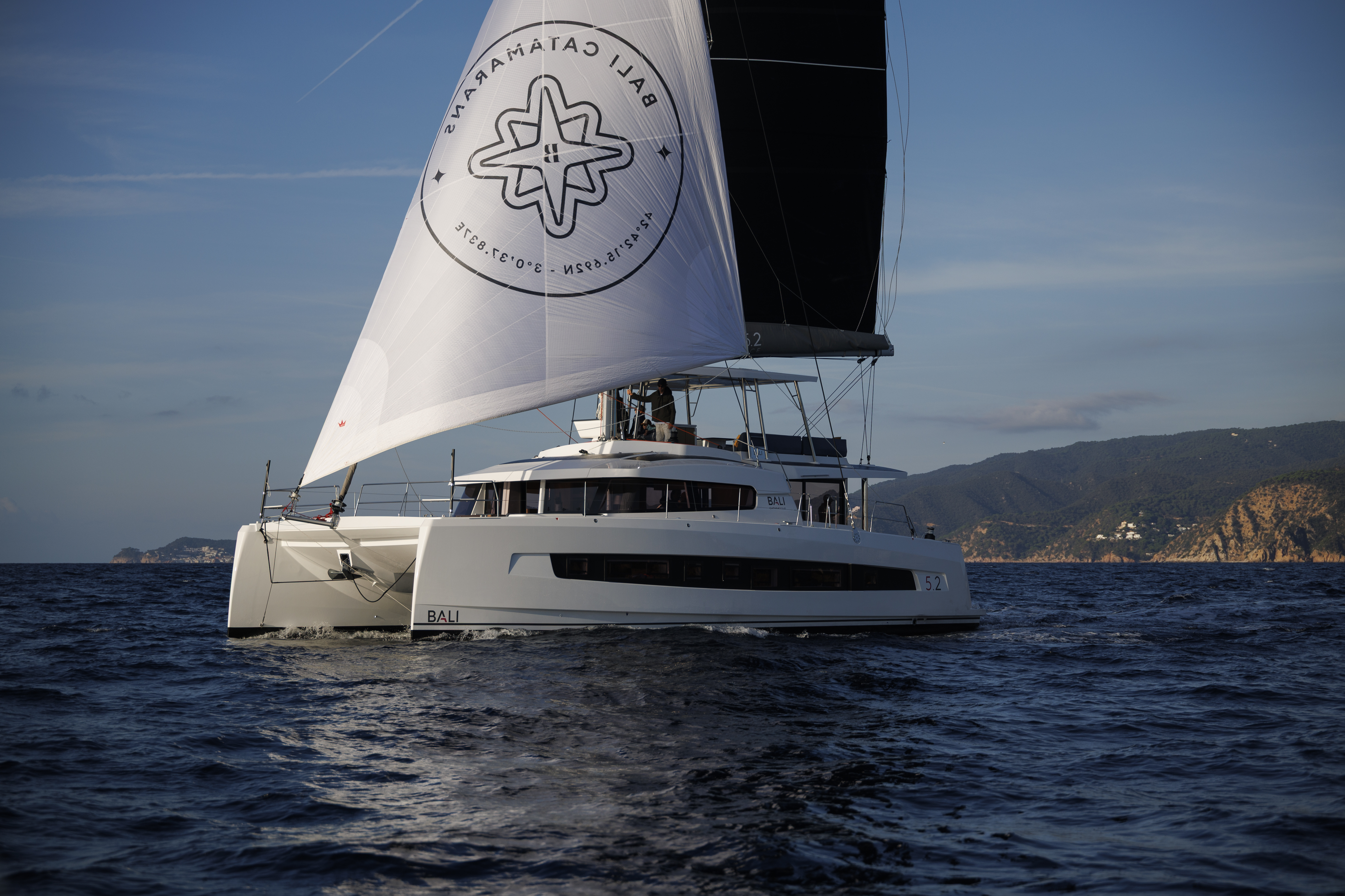 Catamaran, year of build: 2026, Puerto de Andratx, Mallorca, model: Bali 5.2 DISFRUTONA, cabins: 5, heads: 5, berths: 10. The yacht has standard charter equipment including autopilot, electric anchor winch, Bimini top, sprayhood, GPS plotter, depth sounder, wind sensor, log, dinghy, Wi-Fi.