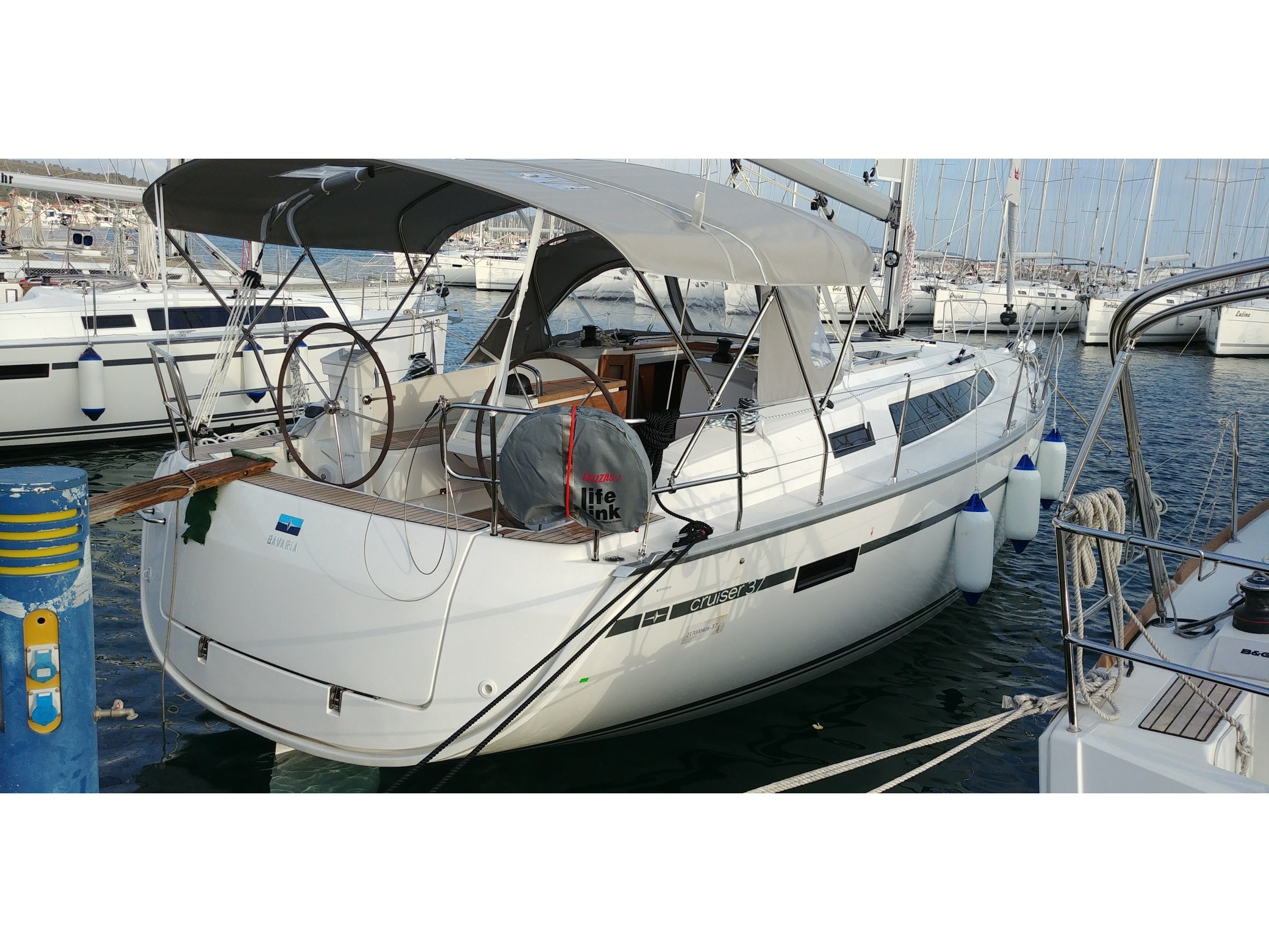 Sailing yacht, year of build: 2020, D-Marin Dalmacija Marina, Sukošan/Zadar, model: Bavaria Cruiser 37 AMALIA, cabins: 3, heads: 1, berths: 7. The yacht has standard charter equipment including autopilot, electric anchor winch, Bimini top, sprayhood, GPS plotter, depth sounder, wind sensor, log, dinghy, Wi-Fi.